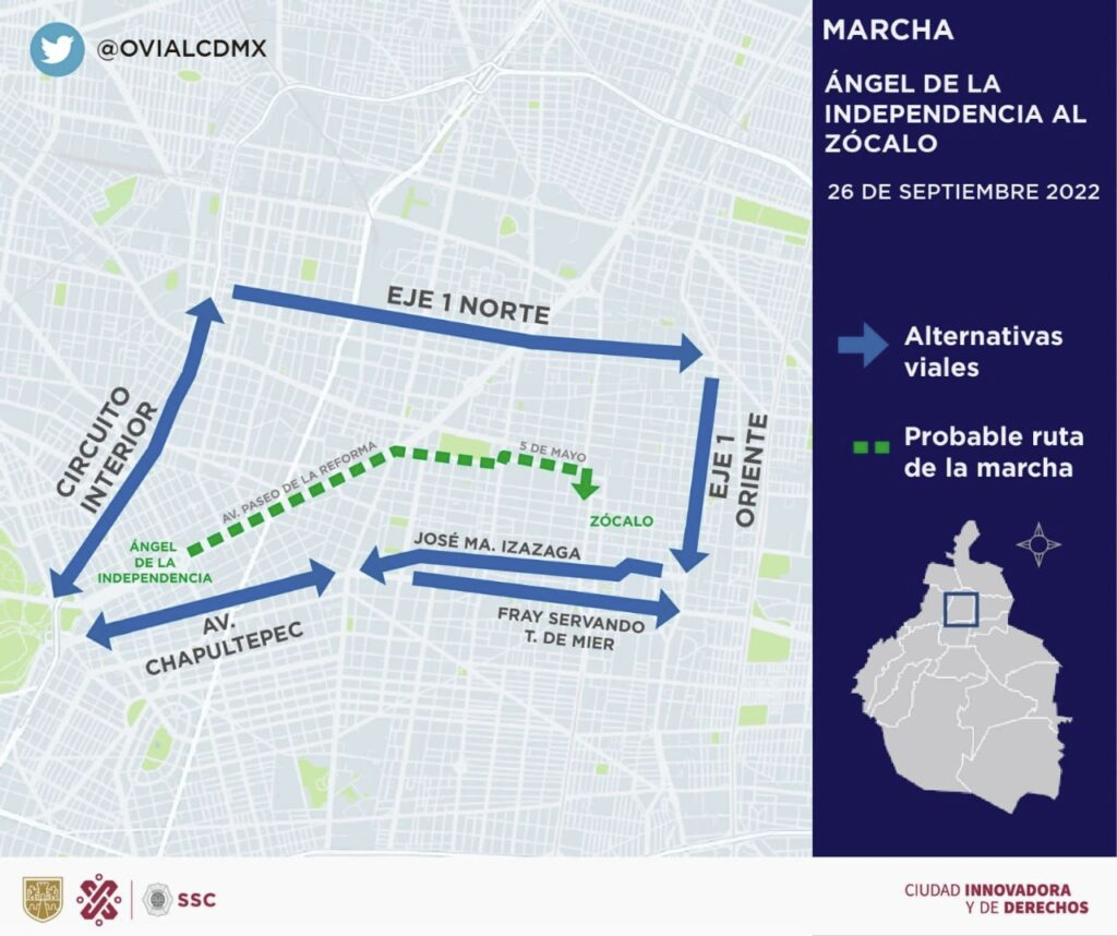 Derivado de la marcha programada para esta tarde, por el Octavo aniversario de la desaparición de los 43 Normalistas de Ayotzinapa, que ira del Ángel de la Independencia al Zócalo capitalino.